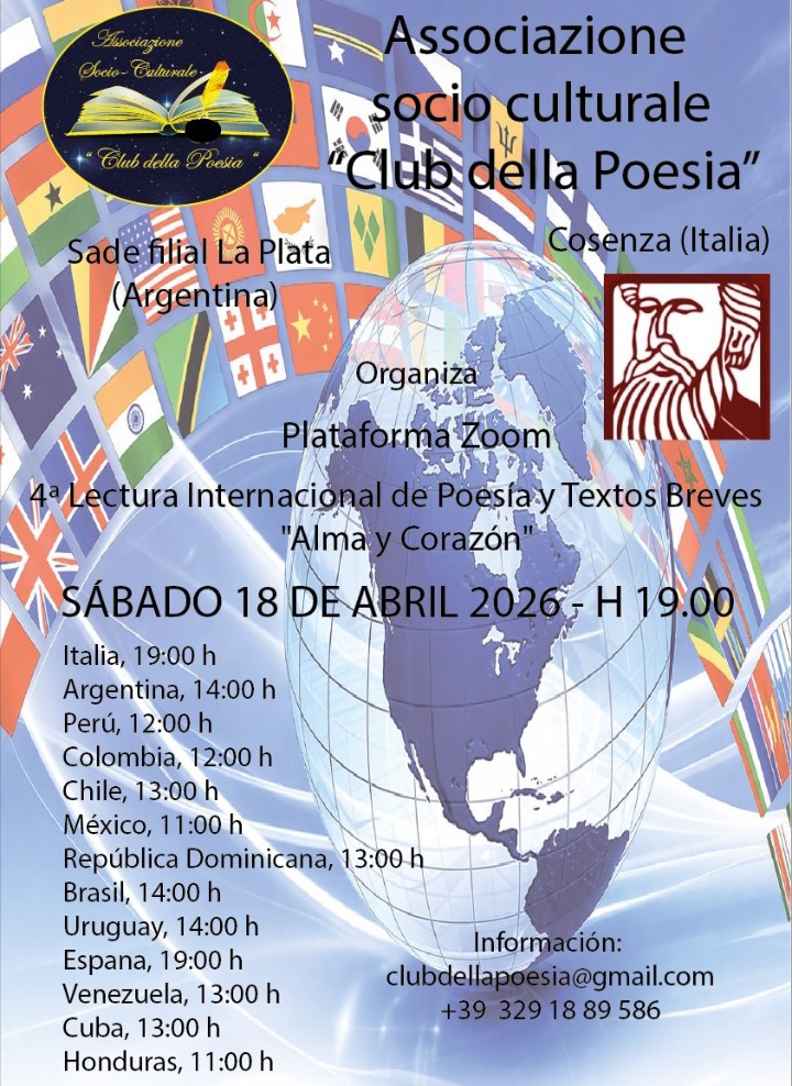 Ayer sábado por la tarde se realizó el 4° Encuentro Internacional de Lectura de Poesía y Textos Cortos, denominado AMOR y CORAZÓN, organizado, mediante plataforma Zoom, por el club de la Poesía de Cosenza, Italia, y la Sociedad Argentina de Escritores SADE Filial La Plata, en el marco del convenio entre ambas instituciones. Fue un exitoso y emotivo evento literario donde participaron representantes de diferentes paises, interviniendo poetas y escritores con sus obras.
